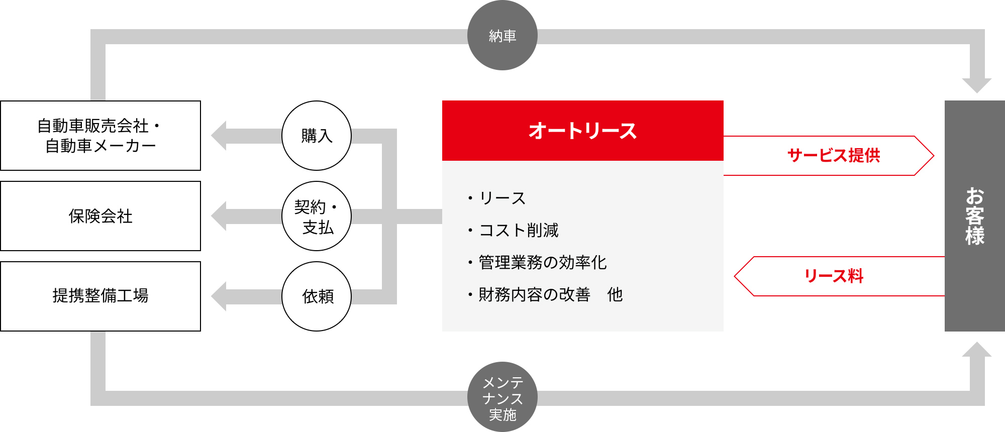 お客様が自動車をご自身で購入するのに比べ、「資金調達」「コスト削減」「管理業務の削減」の3つのメリットがあります。資金調達では、銀行からの融資資金を使わずに自動車を調達できるため、資金を他の投資に充てることができます。コスト削減では、オートリース会社の持つスケールメリットを活かしたメンテナンス料金や自動車代金などの削減が可能になります。管理業務の削減では、自動車管理業務を当社にアウトソーシングすることにより、人材を有効活用できるようになります。これら3つのメリットを享受するために、多くの企業がオートリースを利用しています。